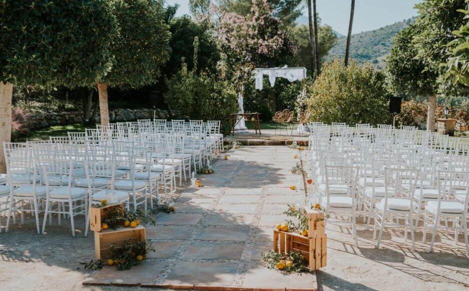 The estate houses 7 functional spaces such as the nerve center of the complex, the central patio. Around the patio is the Hall, which is the permanent interior area with the largest capacity. Also around the central patio, we can find the typical Mediterranean Riu-Rau with the kitchen at the back, the street dels Garrofers, the Oil Mill, the Carriage Museum, and the Stables. In the upper part of the estate, we find the multifunctional area, the largest open space, as well as the gardens with a pool, ceremonial area, and the parking lot.