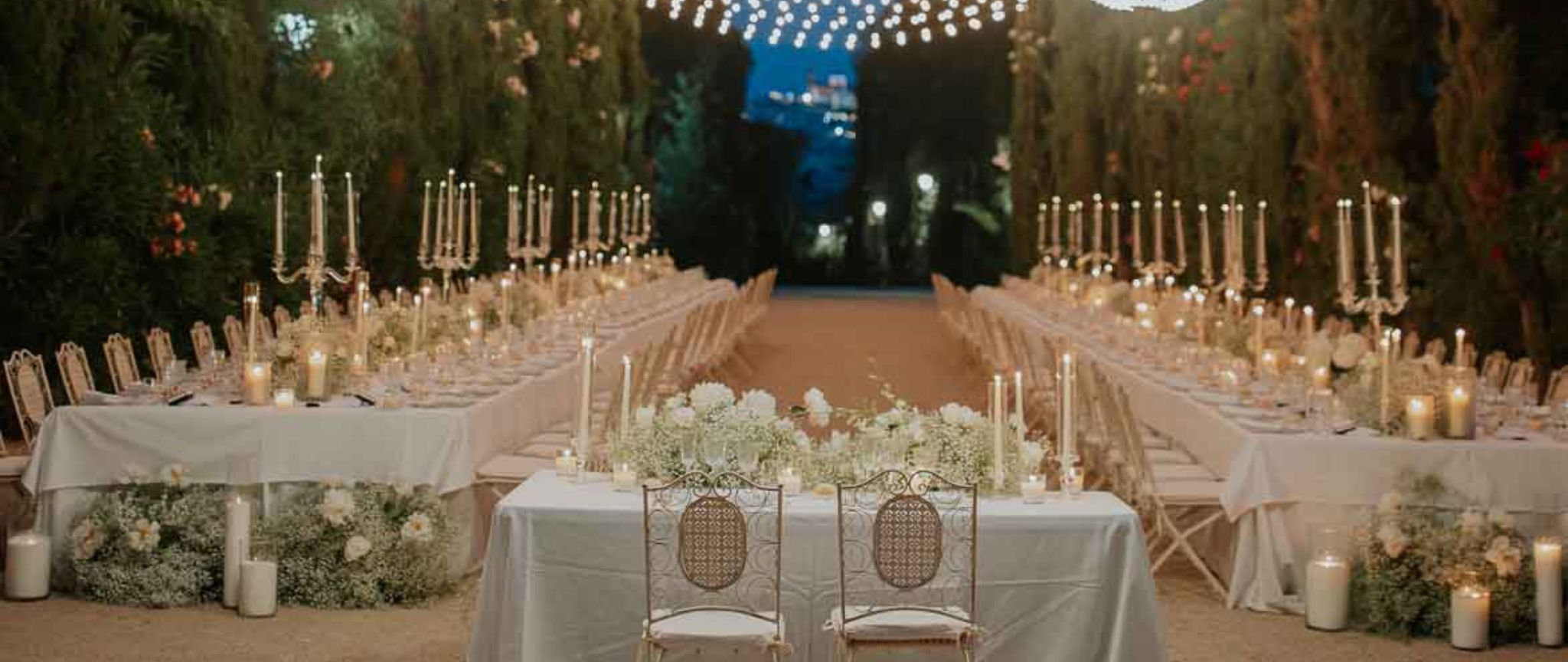 - Fachada del Palacete y Camino de Cipreses es el lugar icónico para la realización de banquetes de noche.